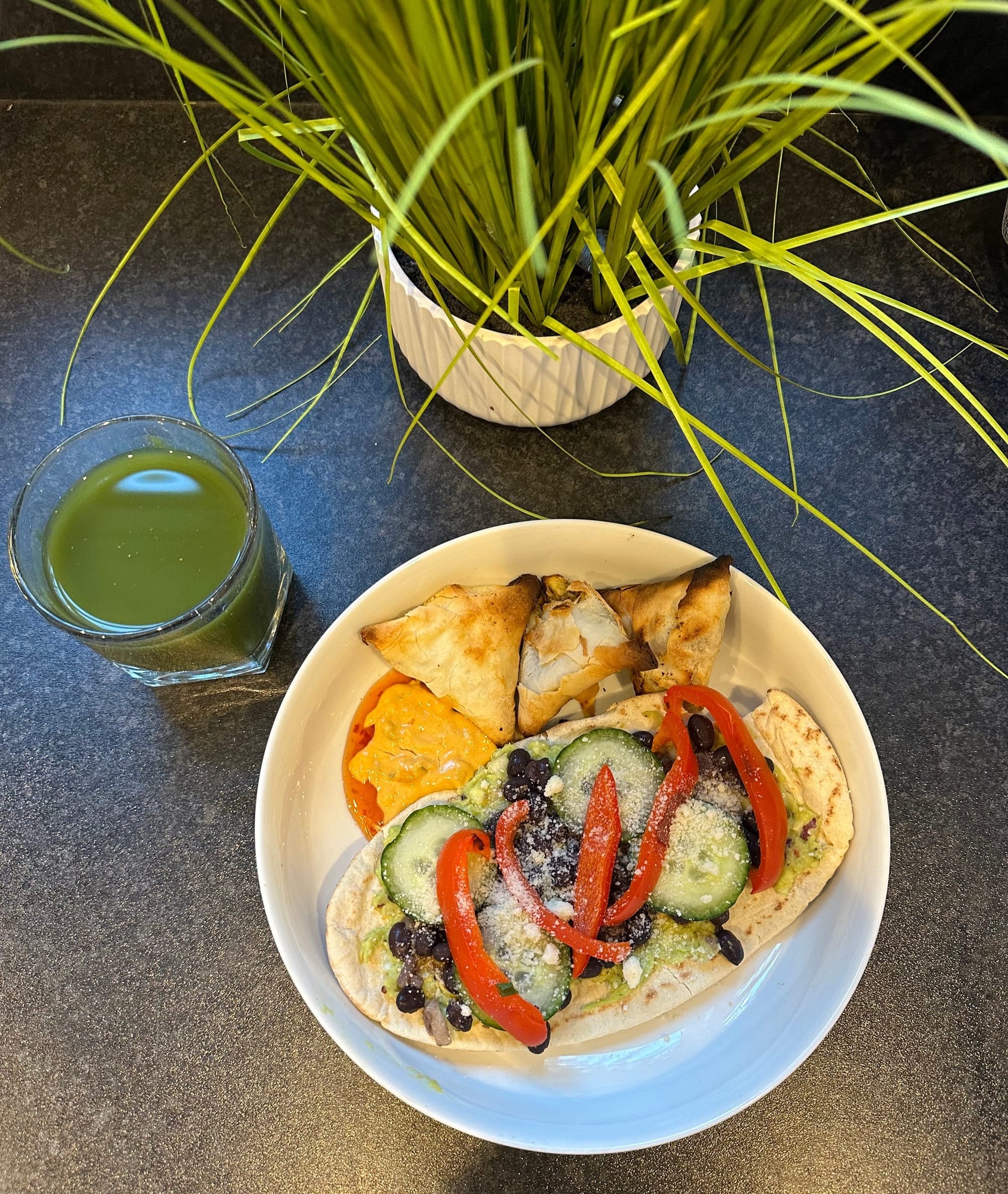 Pitta Bread- Black beans- Avocado- Cucumber- Red Pepper- Vegetable samosas- Cheese