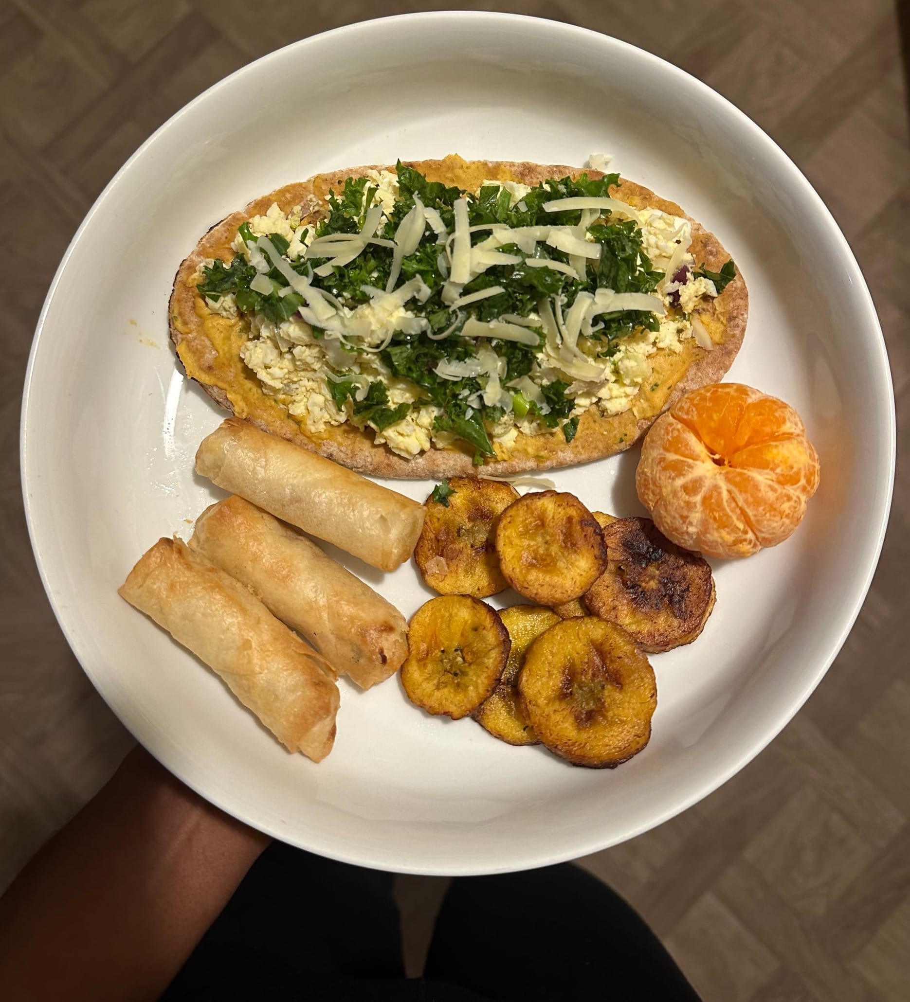 Mexican Hummus base- Boiled egg- Kale- Cheese- Plantain- Vegetable spring rolls- Orange