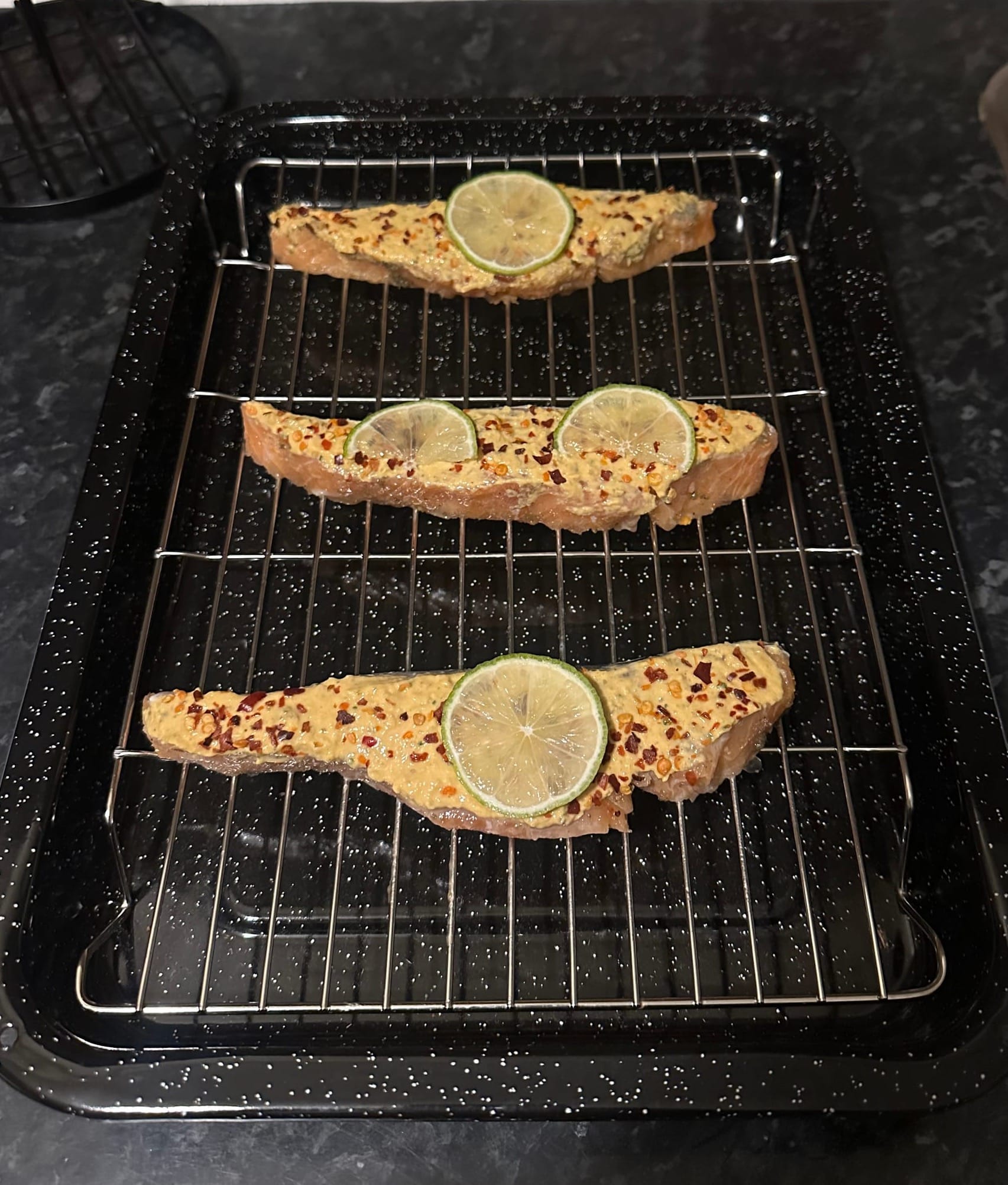 A Mexican Hummus went on top of the Salmon once I finished seasoning it. Then last thing was my chilli flakes and my limes, which I squeezed on the salmon before I put it into the oven.