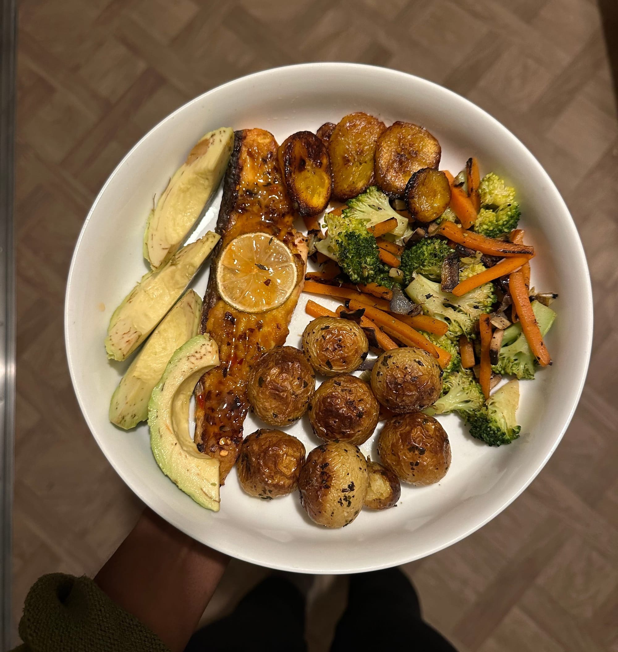 Salmon-Lime- Potato- Plantain- Avocado- Sautéed Vegetables (Broccoli, Mushroom, Onion, Carrot).