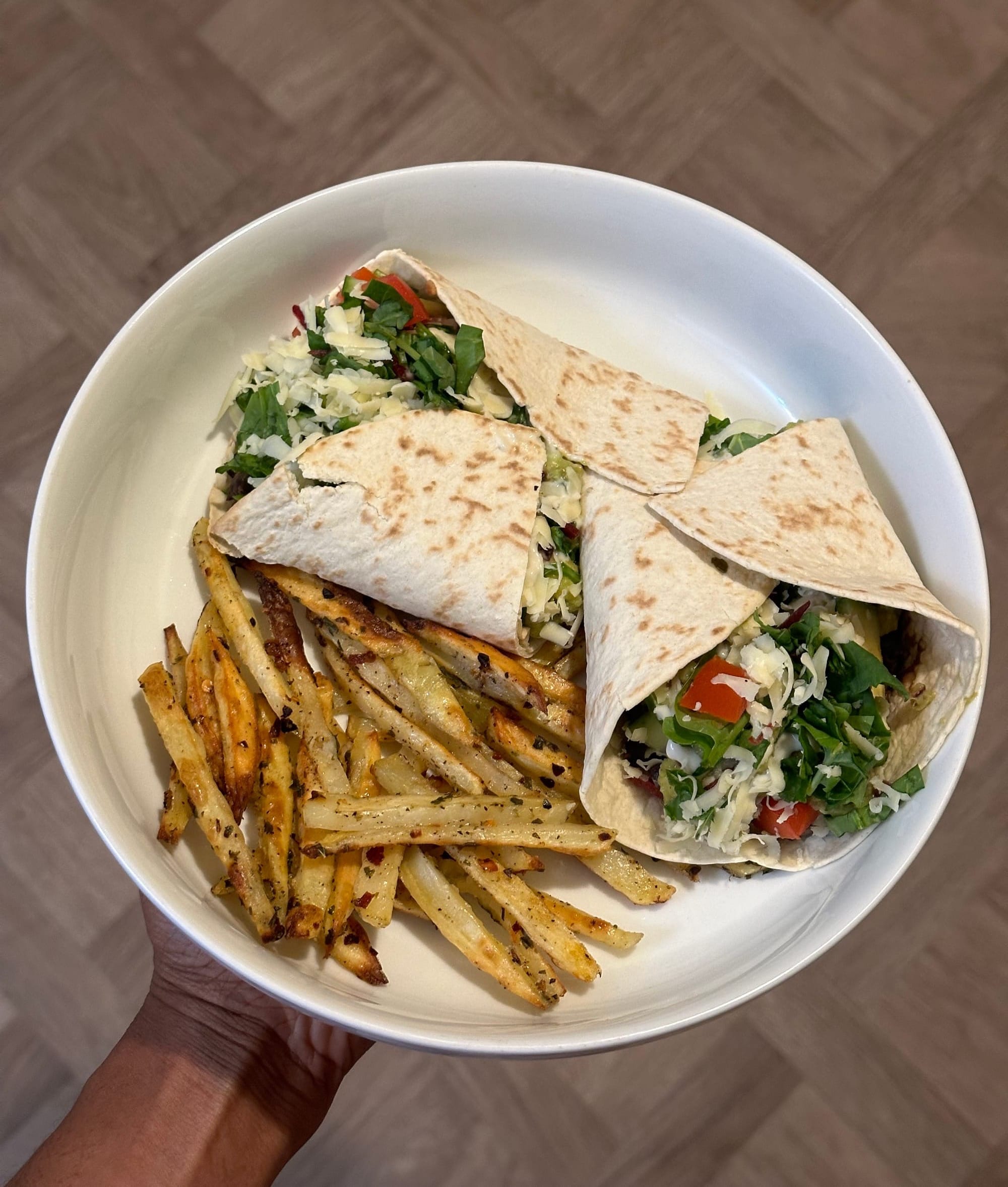Burrito wrap- Black beans- Avocado- Tomato- Cucumber- Salad- Cheese- Homemade Potato Fries